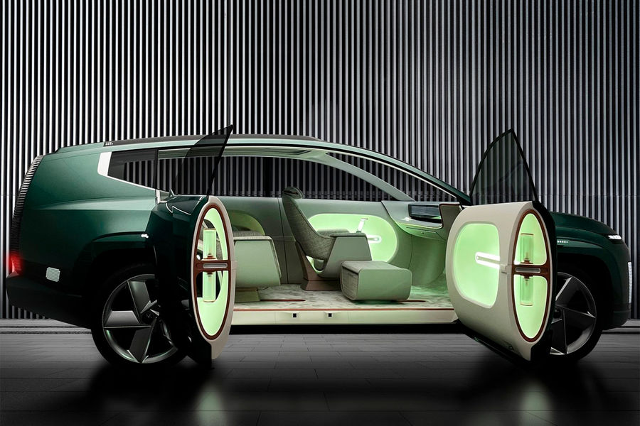 Представленный на автосалоне концепт Seven – прообраз будущего флагманского внедорожника Hyundai. Автомобиль создан на модульной платформе E-GMP и проводится в движение двумя электромоторами суммарной мощностью 320 лошадиных сил.