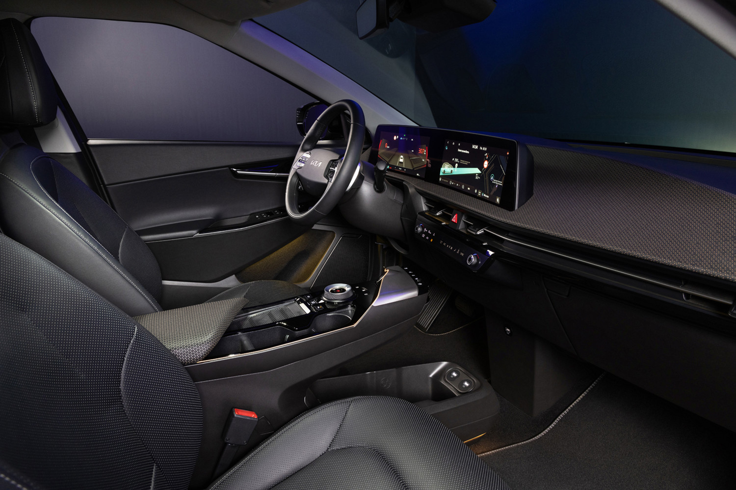 Главными особенностями Kia EV6 называют плоский пол и колесную базу 2900 мм (это больше, чем у Sportage, Sorento и Mohave), благодаря чему простор в салоне сравним со среднеразмерным кроссовером. В салоне установлен панорамный изогнутый экран, в который интегрированы два 12-дюймовых дисплея. Обивка сидений выполнена из переработанного пластика. Объем багажника составляет 520 л и 1300 л при сложенных сиденьях второго ряда. Среди представленных на рынке электромобилей Kia видит конкурентами EV6 модели Audi e-tron и Jaguar I-Pace.