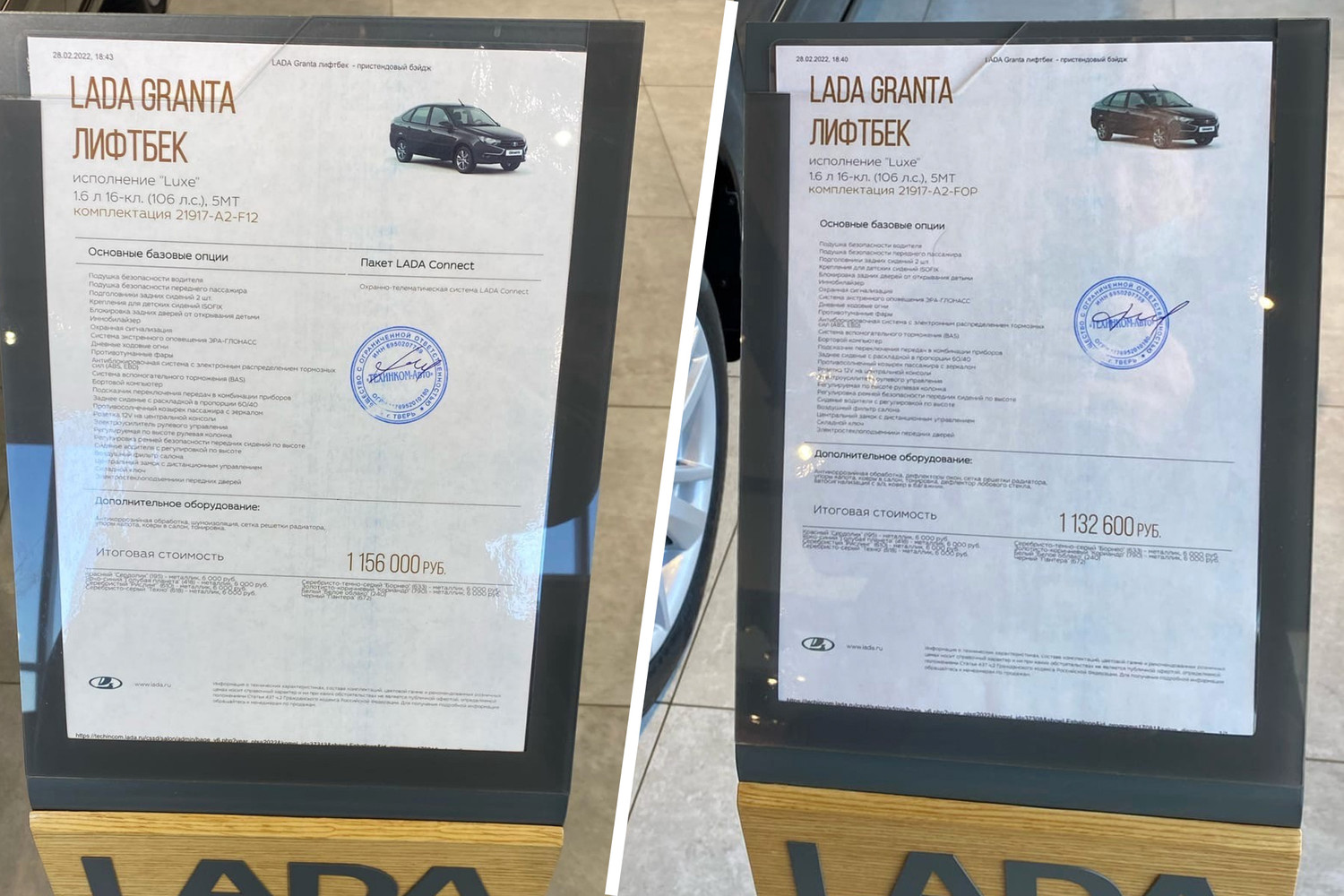 Кроме того, на фотографиях были запечатлены ценники на Lada Granta — самую доступную модель в линейке «АвтоВАЗа». Московский дилер запросил за нее больше миллиона рублей. При этом в прайс-листах отечественного производителя максимальная цена Granta в кузове лифтбек составляет почти 962 тыс. руб.