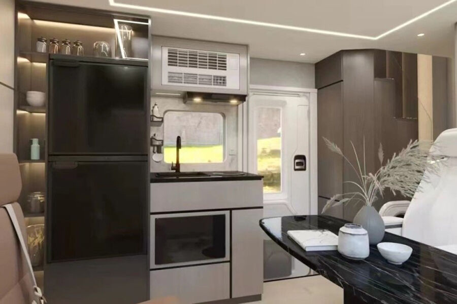 Автодом построен на платформе грузовика Genlion H6 от коммерческого бренда SAIC под названием Hongyan. На первом этаже грузовика располагаются кухня-столовая, санузел и откидная терраса, а на втором — кровать и диван.