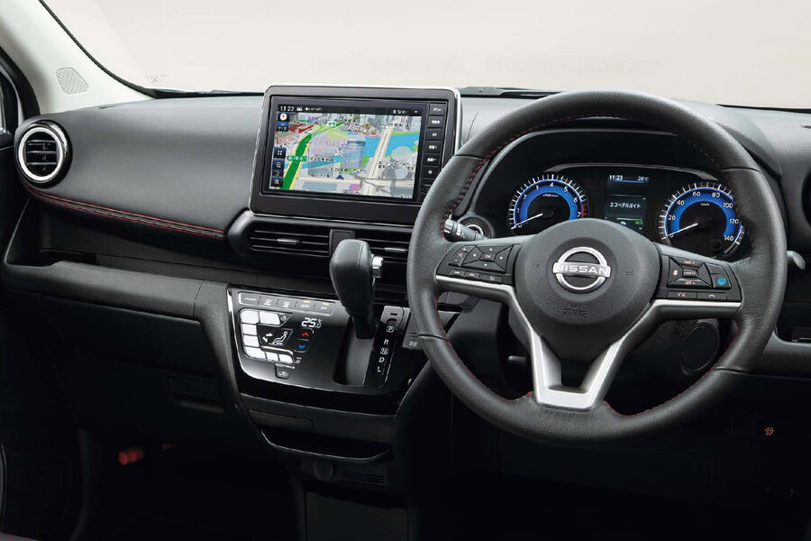 В интерьере обновленного кей-кара специалисты Nissan уделили особое внимание комфорту и удобству. В зависимости от комплектации, автомобиль может получить кожаные кресла с перфорацией цвета черной смородины. На передней панели с пассажирской стороны появился глубокий лоток для вещей.