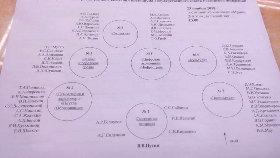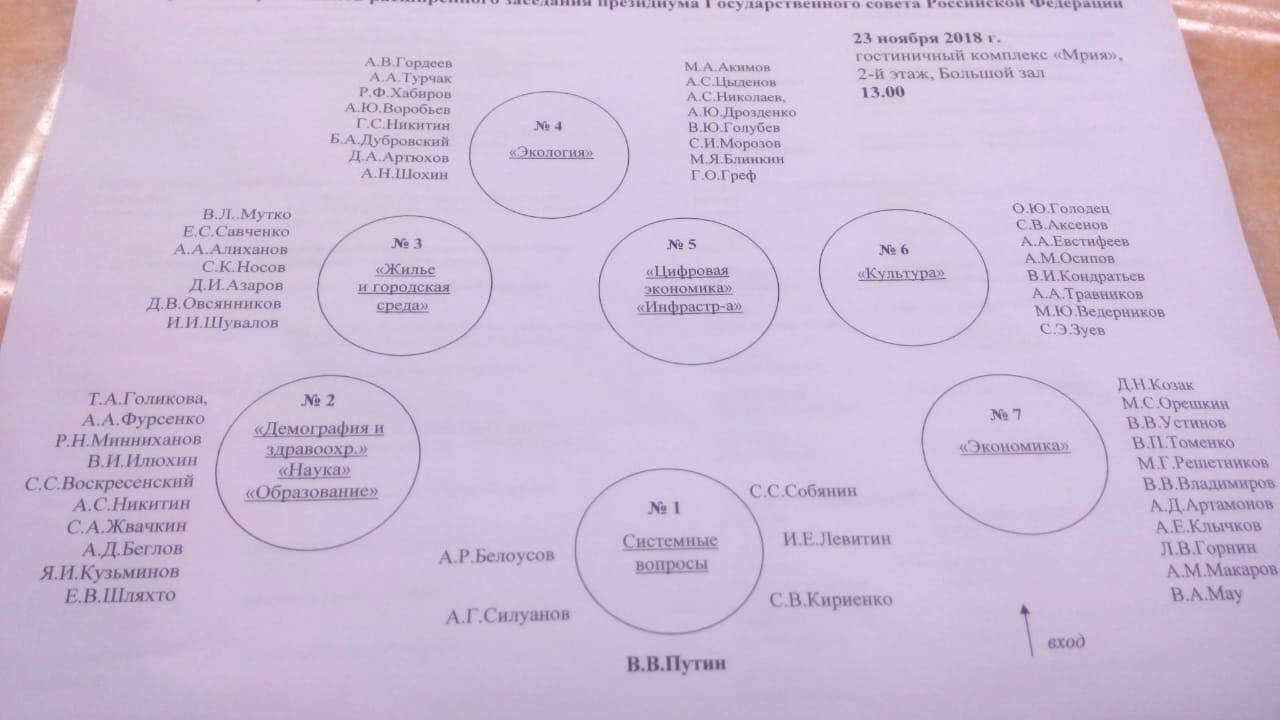 Согласно материалам к заседанию, рассадка за столами предусмотрена тематическая: по основным направлениям работы: системные вопросы; демография, здравоохранение, образование; жилье и городская среда; экология; культура; экономика; цифровая инфраструктура.