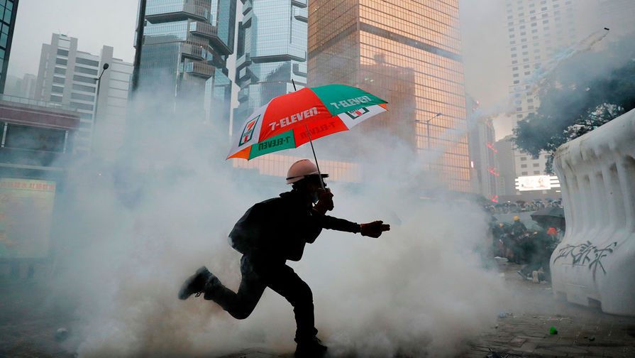 Полиция Гонконга применила слезоточивый у местного штаба Народно-освободительной армии Китая, чтобы разогнать антиправительственных демонстрантов, 31 августа 2019 года