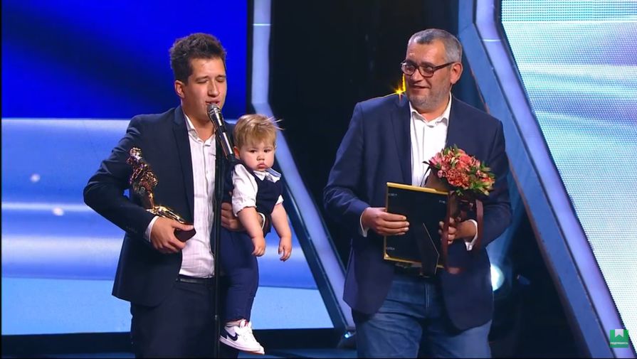 Занин вышел за наградой с малышом на руках. «Я просто вчера прилетел из командировки, завтра улетаю, и сегодня — единственный вечер, который я могу провести с семьей», — объяснил он.