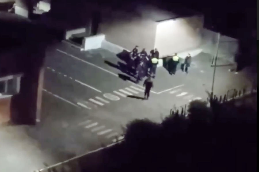 На записи видно, как более десяти сотрудников правоохранительных органов ведут к стене мужчину с заведенными за спину руками, после чего укладывают его на асфальт. В конце ролика к месту задержания подъезжает патрульная машина.