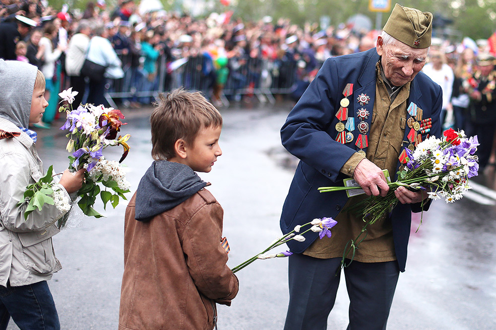 Россия. Севастополь. 9 Мая. Дети поздравляют ветерана ВОВ во время парада Победы, посвященного 69-й годовщине победы в Великой Отечественной войне