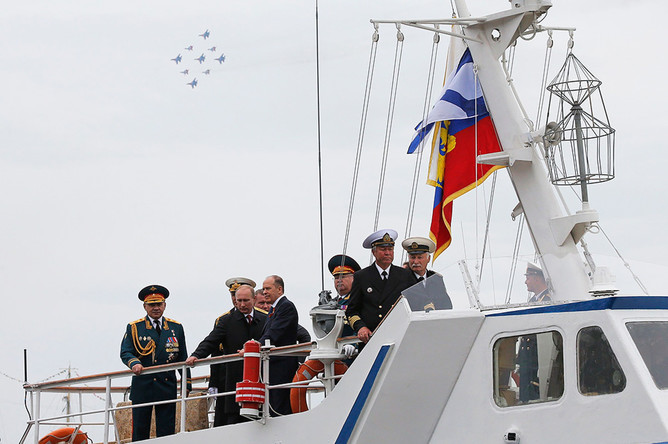 Корреспондент «Газеты.Ru» Наталья Галимова передает из Севастополя: «Путин причалил на катере к берегу под звуки военного оркестра. У него на груди георгиевская ленточка».
