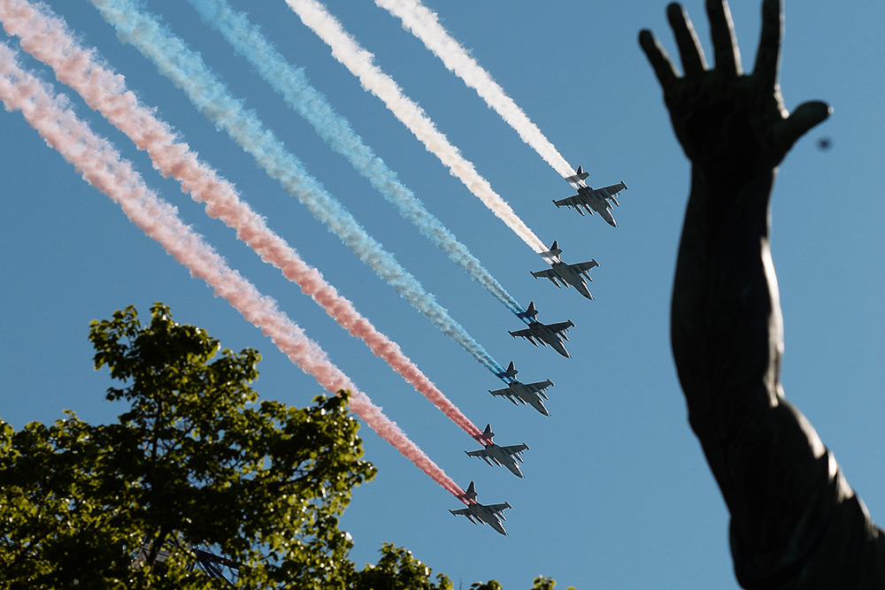 Над парадом летят вертолеты и самолеты ВВС России — зрители аплодируют технике.