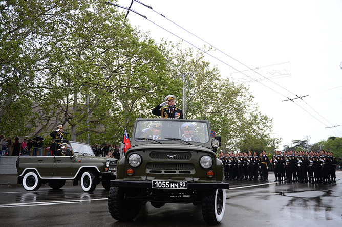 Военный парад в честь Дня Победы и 70-летия освобождения Города-героя начался и в Севастополе. Командует парадом начальник Береговых войск Черноморского флота генерал-майор Александр Остриков, а принимает командующий ЧФ адмирал Александр Витко. В 16 часов в Севастопольской бухте начнется парад кораблей Черноморского флота. В нем примут участие 10 боевых кораблей, включая флагман флота — гвардейский ракетный крейсер «Москва». После морской части парада состоится его воздушная часть, которая будет представлена 70 современными самолетами и вертолетами ВВС России.