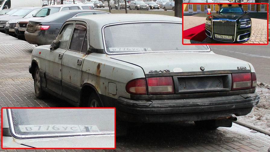 Автомобиль ГАЗ-3110 'Волга' с номерами 'В776УС77' c сайта avto-nomer.ru и кадр с автомобилем проекта 'Кортеж' из трансляции Первого канала, коллаж 'Газеты.Ru'