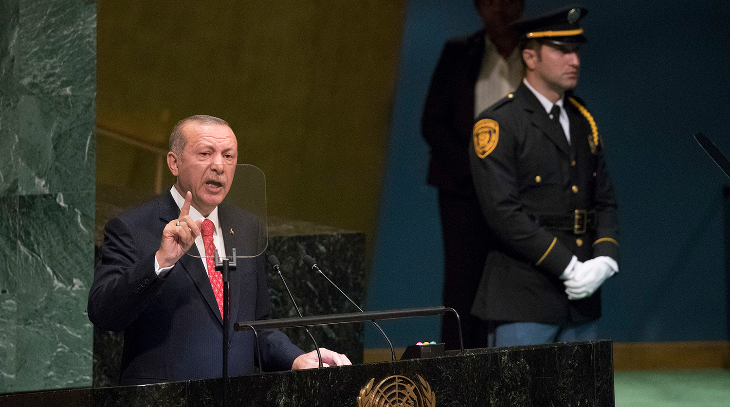В первую очередь, Эрдоган отмечает, что нынешняя Генассамблея проходит в 100-ую годовщину окончания Первой мировой войны. ООН добилась многих успехов в поддержании мирового порядка, сменив на этом поприще Лигу наций, говорит Эрдоган. Но сегодня, по его словам, организация находится в кризисе.