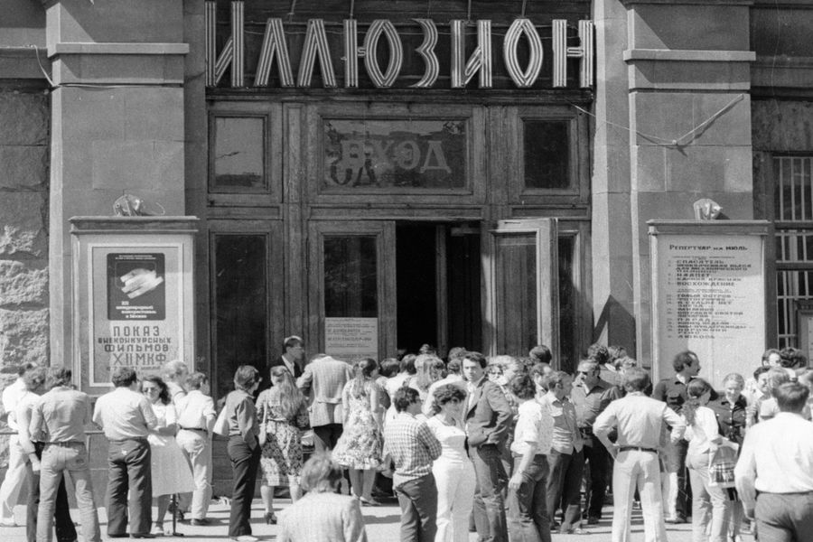 Жители Москвы стоят у входа в кинотеатр «Иллюзион», 1981 год