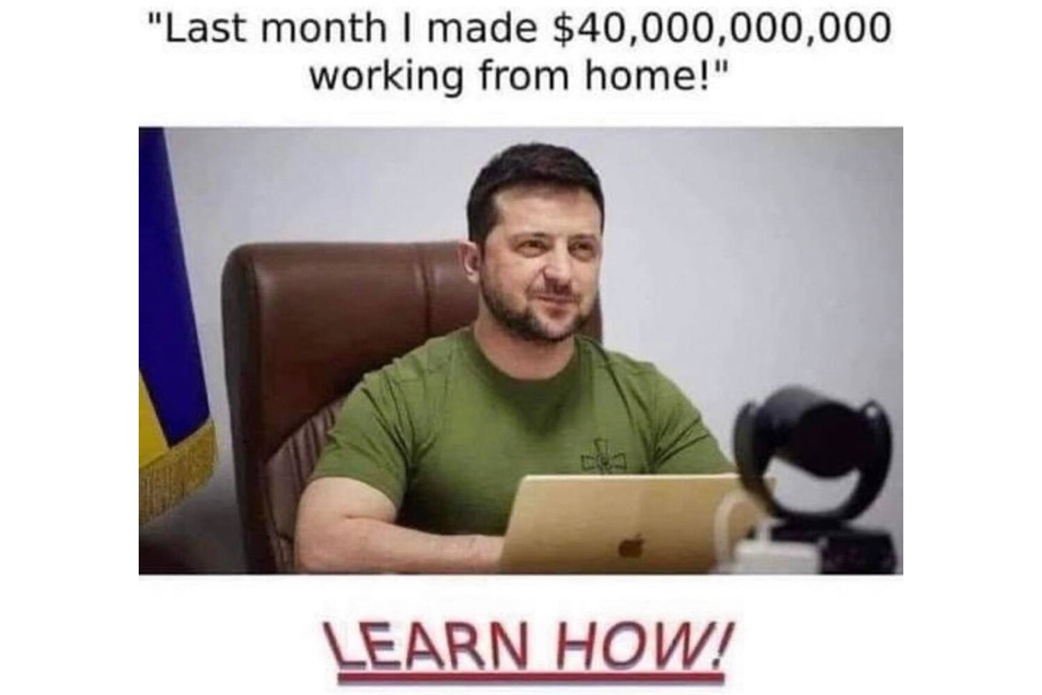 Трамп-младший разместил фотографию украинского лидера в футболке цвета хаки с подписью: «За прошлый месяц я заработал 40 миллиардов долларов, работая из дома! Узнай, как!».