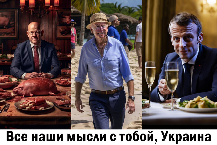 На сгенерированной нейросетью картинке можно увидеть глав трех государств — президента США Джо Байдена, немецкого канцлера Олафа Шольца и французского лидера Эммануэля Макрона. При этом председатель правительства Германии сидит за заставленным едой праздничным столом, хозяин Белого дома прогуливается по пляжу, а президент Франции собирается выпить шампанское.