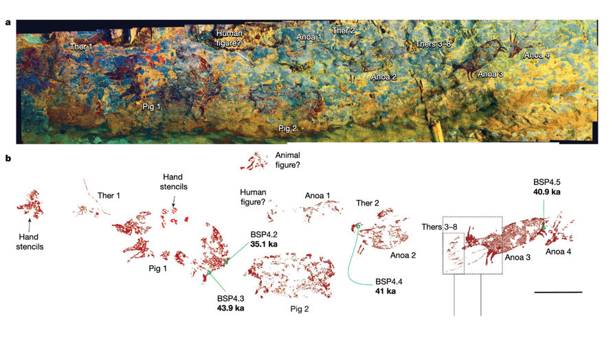 Художники времен палеолита во Франции и Испании рисовали животных древесным углем. Углерод в его составе позволял довольно точно установить возраст рисунков. В рисунках Сулавеси же использован красный пигмент на основе железа, в котором недостаточно органических веществ. Поэтому, чтобы узнать возраст рисунков, ученым пришлось анализировать пробы со стен пещеры, там, где стекала вода. Скопившиеся там минеральные отложения позволили выяснить — рисункам до 44 тыс. лет. Для сравнения -– знаменитым наскальным изображениям в пещере Шове во Франции около 30 тысяч лет.