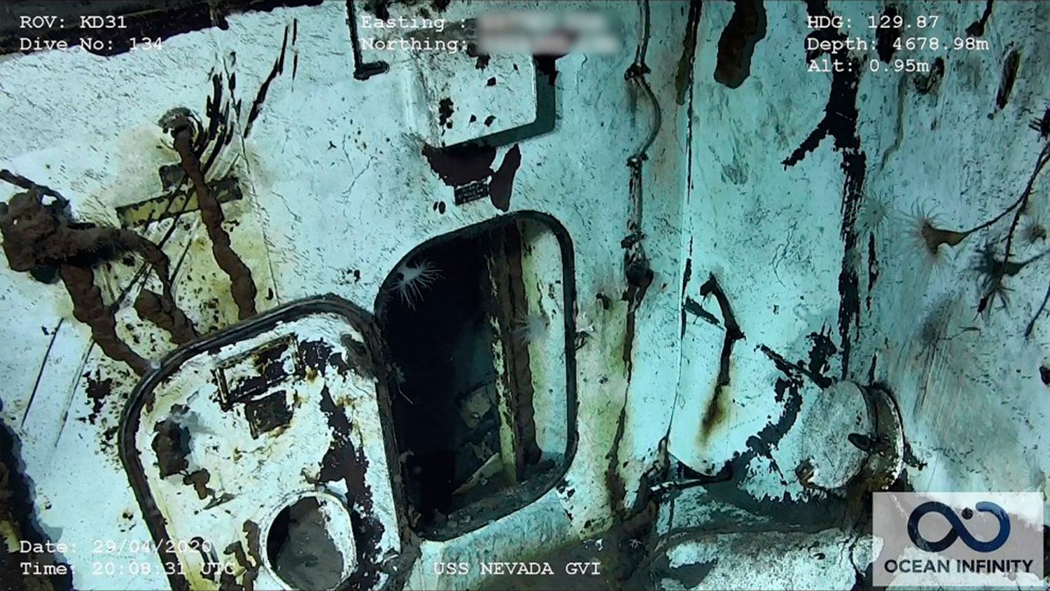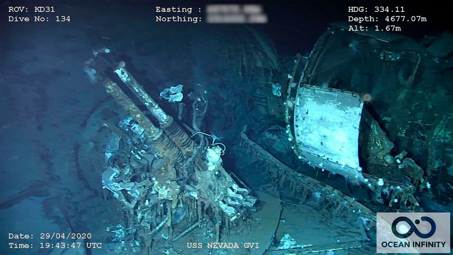 Photo courtesy Ocean Infinity/SEARCH, Inc.При помощи глубоководной камеры исследователи провели съемку затопленного объекта. На кадрах видно, что «Невада» фактически распалась на куски. Металлические детали сильно проржавели и покрылись морской растительностью.