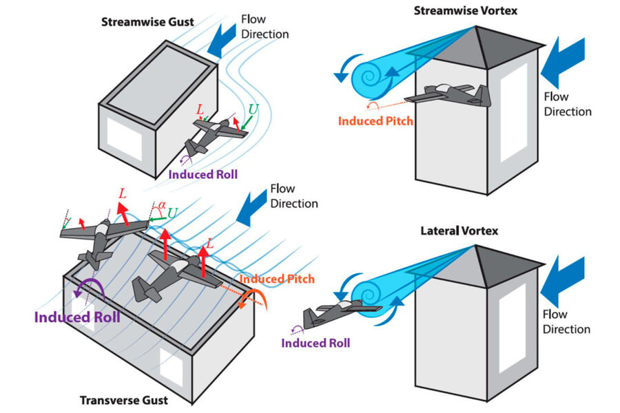 Абдулгани Мохамед и его коллеги провели моделирование полета аэротакси в городе. Наличие множества зданий приводит возникновению хаотичных потоков ветра и турбулентности. Исследование с помощью модели показало, что летательные аппараты самолетного типа при полетах в городе должны страдать от резких изменений угла атаки (обдува) крыльев, что влияет на подъемную силу и управляемость машины. В случае с винтокрылыми аппаратами, вроде мультикоптеров, проблемы от разнонаправленных потоков ветра должны ощущаться еще сильнее из-за малой скорости.