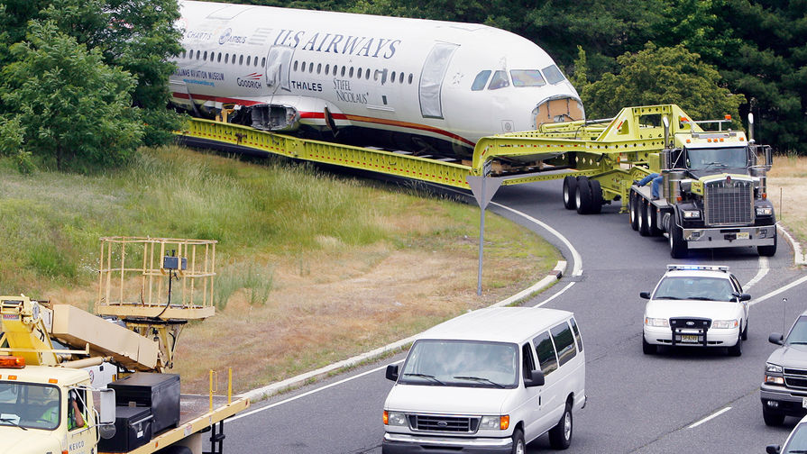 Поврежденный при посадке на Гудзон лайнер Airbus A320 авиакомпании US Airways во время транспортировки в музей авиации Каролины, июнь 2011 года