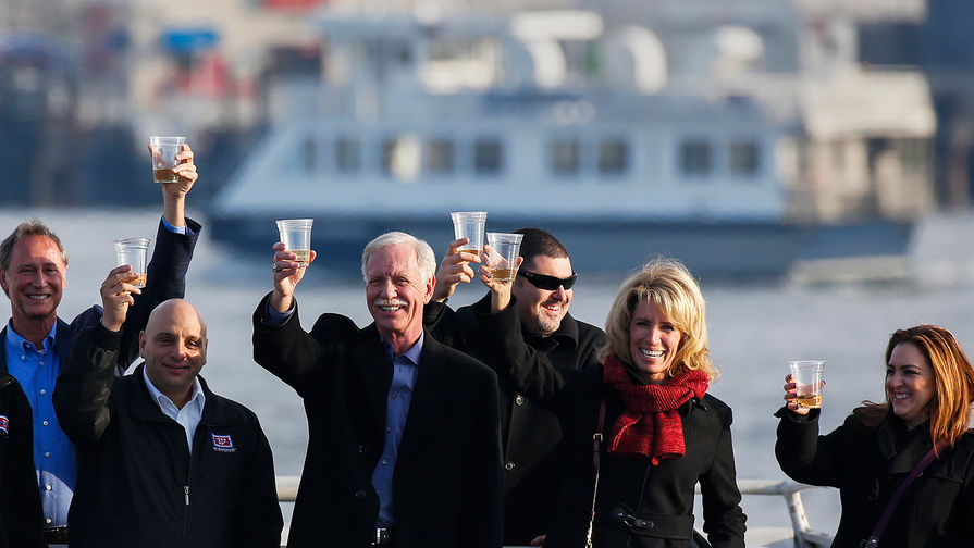 Командир экипажа Чесли «Салли» Салленбергер и пассажиры рейса AWE 1549 во время празднования годовщины успешной посадки лайнера Airbus A320 авиакомпании US Airways на воду реки Гудзон в Нью-Йорке, 15 января 2014 года