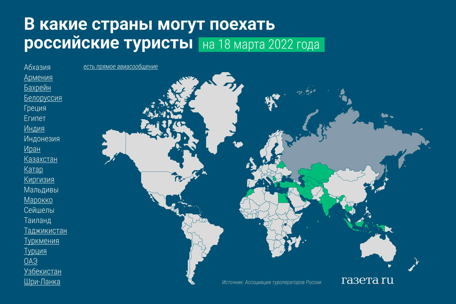 Также в список входят Казахстан, Белоруссия, ОАЭ, Сербия и Израиль. По всем этим направлениям есть прямые авиарейсы. По ряду из них, например, в некоторые страны СНГ, сейчас совершают полеты в том числе и российские авиакомпании, рассказала руководитель пресс-службы сервиса для планирования путешествий OneTwoTrip Елена Шелехова.