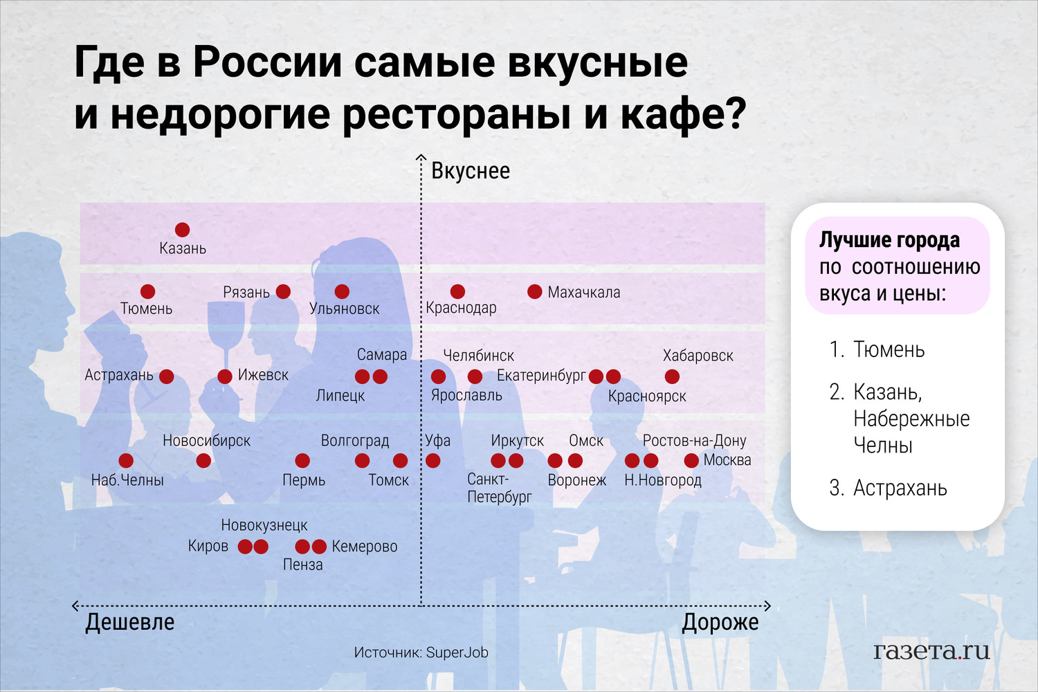 Вкуснее всего — в кафе и ресторанах Казани, дешевле — в Набережных Челнах, а по соотношению вкуса и цены лидируют заведения общественного питания Тюмени, сообщили «Газете.Ru» в SuperJob.