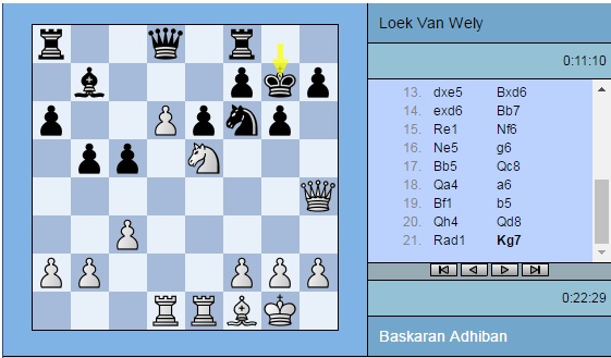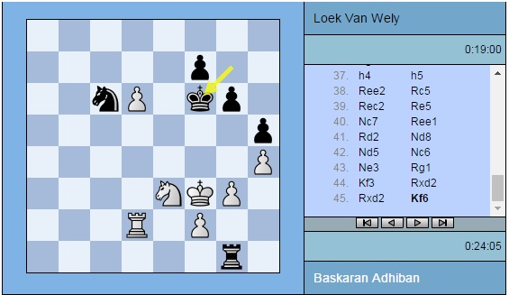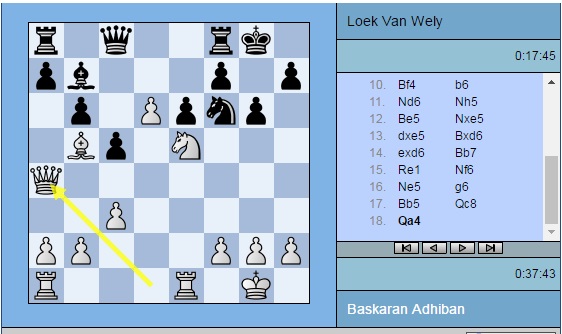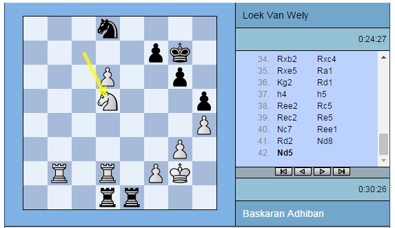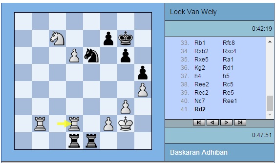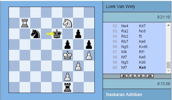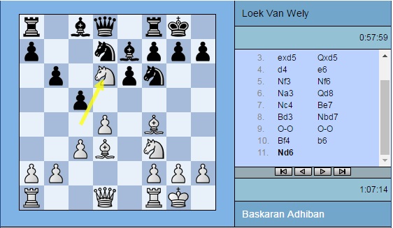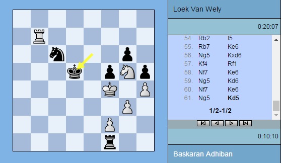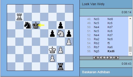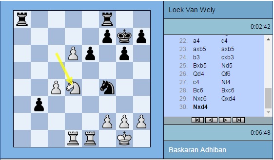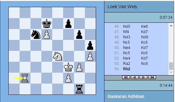 Партия Адхибан — ван Вели: 1. e4 c5 2. c3 d5 3. exd5 Qxd5 4. d4 e6 5. Nf3 Nf6 6. Na3 Qd8 7. Nc4 Be7 8. Bd3 Nbd7 9. O-O O-O 10. Bf4 b6 11. Nd6 Nh5 12. Be5 Nxe5 13. dxe5 Bxd6 14. exd6 Bb7 15. Re1 Nf6 16. Ne5 g6 17. Bb5 Qc8 18. Qa4 a6 19. Bf1 b5 20. Qh4 Qd8 21. Rad1 Kg7 22. a4 c4 23. axb5 axb5 24. b3 cxb3 25. Bxb5 Nd5 26. Qd4 Qf6 27. c4 Nf4 28. Bc6 Bxc6 29. Nxc6 Qxd4 30. Nxd4 b2 31. g3 e5 32. Nb5 Ne6 33. Rb1 Rfc8 34. Rxb2 Rxc4 35. Rxe5 Ra1+ 36. Kg2 Rd1 37. h4 h5 38. Ree2 Rc5 39. Rec2 Re5 40. Nc7 Ree1 41. Rd2 Nd8 42. Nd5 Nc6 43. Ne3 Rg1+ 44. Kf3 Rxd2 45. Rxd2 Kf6 46. Nd5+ Ke6 47. Nf4+ Kd7 48. Nd3 Nd8 49. Nc5+ Kc6 50. Ne4 Kd7 51. Nc5+ Kc6 52. Ne4 Kd7 53. Ra2 Nc6 54. Rb2 f5 55. Rb7+ Ke6 56. Ng5+ Kxd6 57. Kf4 Rf1 58. Nf7+ Ke6 59. Ng5+ Kd6 60. Nf7+ Ke6 61. Ng5+ Kd5 ½-½