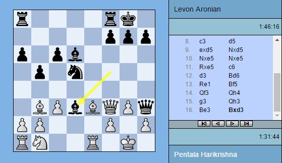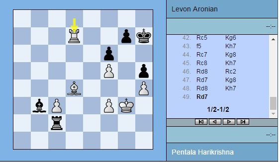 Партия Харикришна — Аронян: 1. e4 e5 2. Nf3 Nc6 3. Bb5 a6 4. Ba4 Nf6 5. O-O Be7 6. Re1 b5 7. Bb3 O-O 8. c3 d5 9. exd5 Nxd5 10. Nxe5 Nxe5 11. Rxe5 c6 12. d3 Bd6 13. Re1 Bf5 14. Qf3 Qh4 15. g3 Qh3 16. Be3 Bxd3 17. Nd2 Qf5 18. Bd4 Rfe8 19. a4 h6 20. Kg2 Qxf3+ 21. Nxf3 Bf5 22. Be5 Bc5 23. Nd4 Bd7 24. axb5 axb5 25. Rxa8 Rxa8 26. Nxb5 Be6 27. Nd4 Bxd4 28. Bxd4 Nf4+ 29. gxf4 Bxb3 30. Kg3 f6 31. h4 h5 32. Bc5 Rd8 33. Bd4 Ra8 34. f3 Ra2 35. Re8+ Kh7 36. Re7 Kg8 37. Re2 Kh7 38. Re7 Kg8 39. Rb7 Rxb2 40. Rb6 Kh7 41. Rxc6 Rd2 42. Rc5 Kg6 43. f5+ Kh7 44. Rc7 Kg8 45. Rc8+ Kh7 46. Rd8 Rc2 47. Rd7 Kg8 48. Rd8+ Kh7 49. Rd7 ½-½