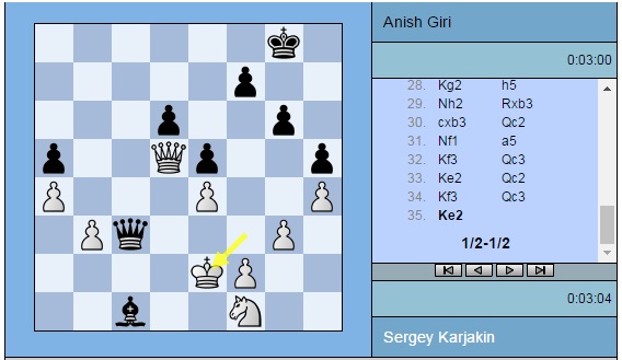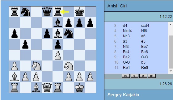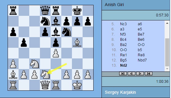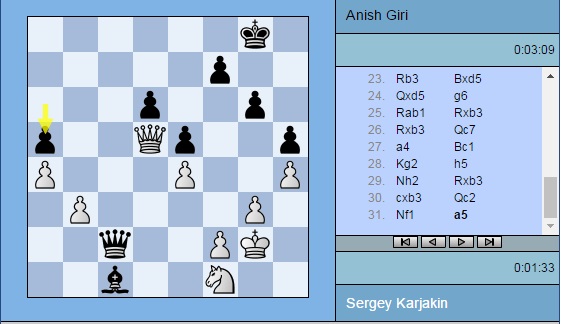 Партия Карякин — Гири: 1. e4 c5 2. Nf3 d6 3. d4 cxd4 4. Nxd4 Nf6 5. Nc3 a6 6. a3 e5 7. Nf3 Be7 8. Bc4 Be6 9. Ba2 O-O 10. O-O b5 11. Re1 Re8 12. Bg5 Nbd7 13. Nd2 Rb8 14. Bxf6 Nxf6 15. Nf1 b4 16. Nd5 bxa3 17. bxa3 Nxd5 18. Bxd5 Bg5 19. g3 Qd7 20. Qd3 Rb6 21. h4 Bh6 22. Reb1 Reb8 23. Rb3 Bxd5 24. Qxd5 g6 25. Rab1 Rxb3 26. Rxb3 Qc7 27. a4 Bc1 28. Kg2 h5 29. Nh2 Rxb3 30. cxb3 Qc2 31. Nf1 a5 32. Kf3 Qc3+ 33. Ke2 Qc2+ 34. Kf3 Qc3+ 35. Ke2 ½-½