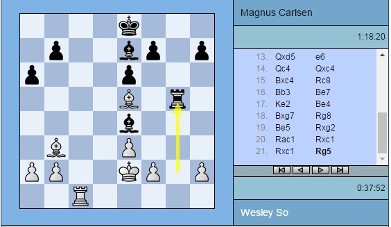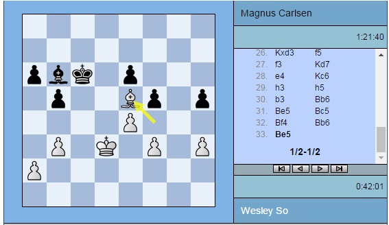 Партия Со — Карлсен: 1. d4 d5 2. c4 c6 3. Nf3 Nf6 4. e3 Bf5 5. Nc3 a6 6. Ne5 Nbd7 7. Qb3 Qc7 8. cxd5 Nxe5 9. dxe5 Nxd5 10. Nxd5 cxd5 11. Bd2 Qxe5 12. Bc3 Qc7 13. Qxd5 e6 14. Qc4 Qxc4 15. Bxc4 Rc8 16. Bb3 Be7 17. Ke2 Be4 18. Bxg7 Rg8 19. Be5 Rxg2 20. Rac1 Rxc1 21. Rxc1 Rg5 22. Bf4 Rc5 23. Rxc5 Bxc5 24. Bc4 b5 25. Bd3 Bxd3+ 26. Kxd3 f5 27. f3 Kd7 28. e4 Kc6 29. h3 h5 30. b3 Bb6 31. Be5 Bc5 32. Bf4 Bb6 33. Be5 ½-½
