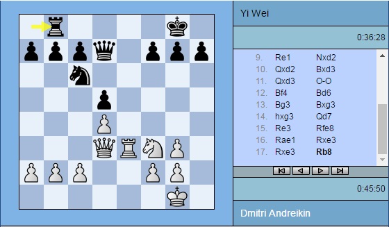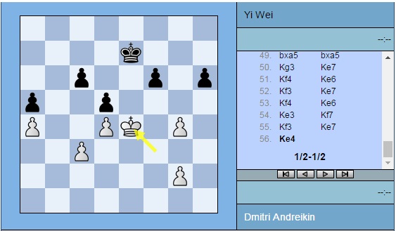 Партия Андрейкин — Вэй И: 1. e4 e5 2. Nf3 Nf6 3. Nxe5 d6 4. Nf3 Nxe4 5. d4 d5 6. Bd3 Nc6 7. O-O Be7 8. Nbd2 Bf5 9. Re1 Nxd2 10. Qxd2 Bxd3 11. Qxd3 O-O 12. Bf4 Bd6 13. Bg3 Bxg3 14. hxg3 Qd7 15. Re3 Rfe8 16. Rae1 Rxe3 17. Rxe3 Rb8 18. Qe2 h6 19. c3 Kf8 20. Kh2 a6 21. Qc2 Kg8 22. Nh4 g6 23. f4 Qg4 24. Nf3 Qd7 25. f5 Qxf5 26. Qxf5 gxf5 27. Nh4 Kg7 28. Nxf5+ Kf6 29. Rf3 Kg6 30. Nh4+ Kg7 31. Nf5+ Kg6 32. g4 Rh8 33. Nh4+ Kg7 34. Nf5+ Kg6 35. Kg3 Re8 36. Nh4+ Kg7 37. Nf5+ Kg6 38. Nh4+ Kg7 39. Rf5 Ne7 40. Re5 f6 41. Rxe7+ Rxe7 42. Nf5+ Kf8 43. Nxe7 Kxe7 44. Kf4 Ke6 45. a4 b6 46. b3 c6 47. b4 a5 48. Kf3 Kd6 49. bxa5 bxa5 50. Kg3 Ke7 51. Kf4 Ke6 52. Kf3 Ke7 53. Kf4 Ke6 54. Ke3 Kf7 55. Kf3 Ke7 ½-½