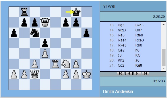 Несколько забыли мы про противостояние Дмитрий Андрейкин (Россия) – Вэй И (Китай). Но и события там развиваются не особо стремительно. «Железная ничья», — говорят одни комментаторы. «Для черных позиция все еще весьма непростая», — отмечают другие.