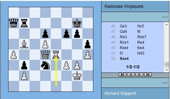 И буквально тут же завершилось последнее противостояние 4-го тура. Ничья в партии бескомпромиссных бойцов Раппорта и Войташека.