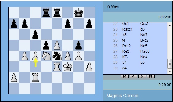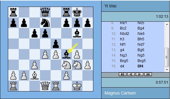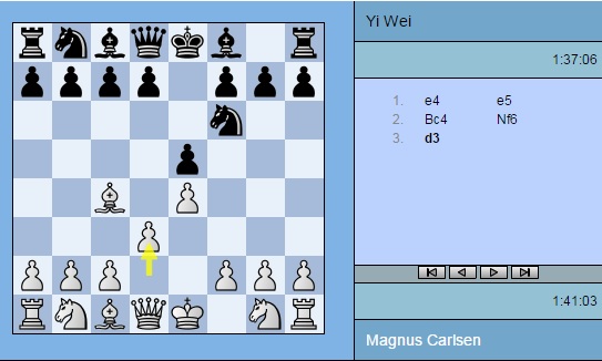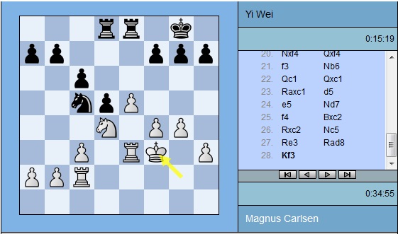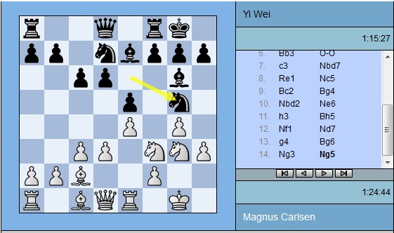 Партия Карлсен — Вэй И: 1. e4 e5 2. Bc4 Nf6 3. d3 c6 4. Nf3 d6 5. O-O Be7 6. Bb3 O-O 7. c3 Nbd7 8. Re1 Nc5 9. Bc2 Bg4 10. Nbd2 Ne6 11. h3 Bh5 12. Nf1 Nd7 13. g4 Bg6 14. Ng3 Ng5 15. Bxg5 Bxg5 16. d4 Bf4 17. Ne2 Qf6 18. Kg2 exd4 19. Nfxd4 Rfe8 20. Nxf4 Qxf4 21. f3 Nb6 22. Qc1 Qxc1 23. Raxc1 d5 24. e5 Nd7 25. f4 Bxc2 26. Rxc2 Nc5 27. Re3 Rad8 28. Kf3 Ne4 29. b4 g5 30. c4 c5 31. Nb5