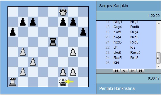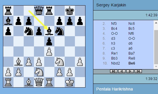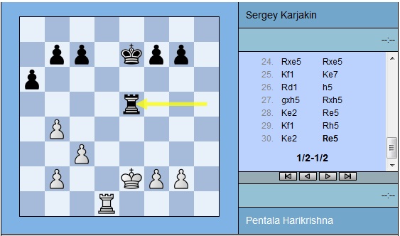 Партия Харикришна — Карякин: 1. e4 e5 2. Nf3 Nc6 3. Bc4 Bc5 4. O-O Nf6 5. d3 O-O 6. h3 d6 7. c3 a6 8. Re1 Ba7 9. Bb3 Re8 10. Nbd2 Be6 11. Nf1 h6 12. Be3 Bxe3 13. Nxe3 Qd7 14. Nh2 Bxb3 15. axb3 Ne7 16. b4 d5 17. Nhg4 Nxg4 18. Qxg4 Rad8 19. exd5 Qxg4 20. hxg4 Nxd5 21. Nxd5 Rxd5 22. d4 Kf8 23. dxe5 Rexe5 24. Rxe5 Rxe5 25. Kf1 Ke7 26. Rd1 h5 27. gxh5 Rxh5 28. Ke2 Re5+ 29. Kf1 Rh5 30. Ke2 Re5+
