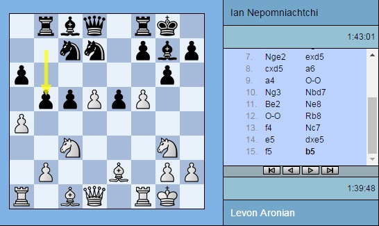 Партия Аронян — Непомнящий: 1. d4 Nf6 2. c4 g6 3. f3 e6 4. Nc3 c5 5. d5 d6 6. e4 Bg7 7. Nge2 exd5 8. cxd5 a6 9. a4 O-O 10. Ng3 Nbd7 11. Be2 Ne8 12. O-O Rb8 13. f4 Nc7 14. e5 dxe5 15. f5 b5 16. d6 Ne8 17. axb5 axb5 18. Nce4 c4 19. Bg5 Nef6 20. Kh1 Bb7 21. Bf3 Bxe4 22. Nxe4 Qb6 23. Qe1