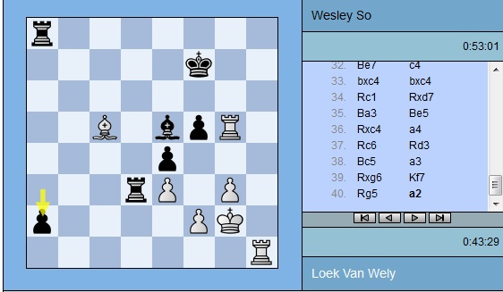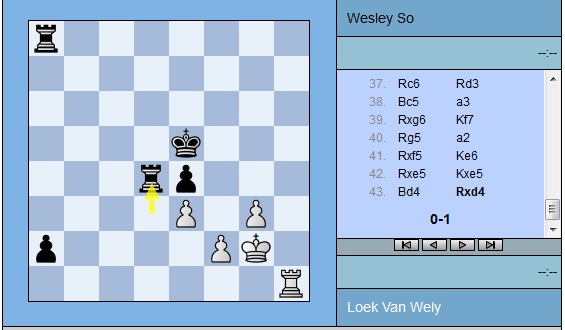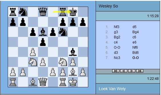 Партия Люк ван Вели — Уэсли Со: 1. Nf3 d5 2. g3 Bg4 3. Bg2 c6 4. c4 e6 5. O-O Nf6 6. d3 Bd6 7. Nc3 O-O 8. Qb3 Qb6 9. cxd5 Qxb3 10. axb3 exd5 11. Be3 a6 12. h3 Bxf3 13. Bxf3 Nbd7 14. d4 Rfe8 15. Kg2 g6 16. Bh6 Ne4 17. Rad1 f5 18. h4 Ndf6 19. e3 a5 20. Rh1 Ra6 21. Ra1 Rea8 22. Nxe4 Nxe4 23. Bxe4 dxe4 24. d5 c5 25. h5 Rb6 26. hxg6 hxg6 27. Bg5 Be5 28. Rad1 Rxb3 29. d6 Rd3 30. d7 Bc7 31. b3 b5 32. Be7 c4 33. bxc4 bxc4 34. Rc1 Rxd7 35. Ba3 Be5 36. Rxc4 a4 37. Rc6 Rd3 38. Bc5 a3 39. Rxg6+ Kf7 40. Rg5 a2 41. Rxf5+ Ke6 42. Rxe5+ Kxe5 43. Bd4+ Rxd4 0-1