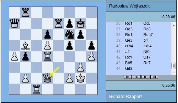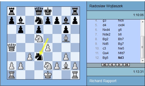 Партия Раппорт — Войташек: 1. e4 c5 2. Nc3 d6 3. Nge2 Nf6 4. g3 Nc6 5. d4 cxd4 6. Nxd4 g6 7. Nde2 b6 8. Bg2 Bb7 9. Nd5 Bg7 10. c3 Ne5 11. Qa4+ Nfd7 12. Bg5 Nd3+ 13. Kf1 Nc5 14. Qc2 Nf6 15. Bxf6 Bxf6 16. Nxf6+ exf6 17. Nf4 O-O 18. h4 Re8 19. Nd5 Bxd5 20. exd5 f5 21. Rd1 Qf6 22. Qd2 h5 23. Bf3 Re5 24. Kg2 Rae8 25. Qf4 b5 26. a3 Qd8 27. Rd4 Qb6 28. Rhd1 a5 29. Qh6 Nd7 30. Qg5 Kg7 31. Qd2 Nc5 32. Qc2 R5e7 33. R1d2 Nd7 34. Be2 Nf6 35. Bf1 Ne4 36. Rd1 Qc5 37. Qd3 Rb8 38. Re1 Reb7 39. Qe3 b4 40. cxb4 axb4 41. a4 Nf6 42. Rc1 Qa7 43. Bb5 Re7 44. Qd2 b3 45. Rd3 Ne4 46. Qe3 Nc5 47. Qd4+ f6 48. Re3 Rbb7 49. Rce1 Re4 50. Rxe4 fxe4 51. f3 Nd3 52. Rxe4 ½-½