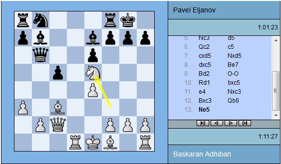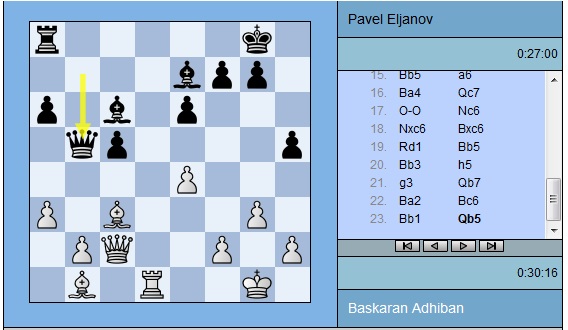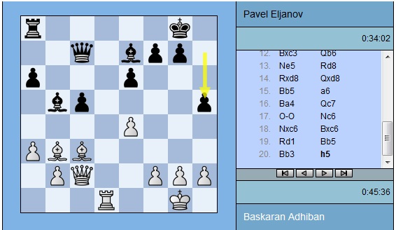 Адхибан отставил без отклика предлагаемый Эльяновым гамбит, индийский гроссмейстер предпочитает планомерную осаду позиции черных.