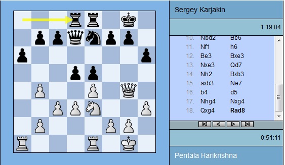 Равная позиция с разменянными фигурами установилась в противостоянии Харикришна — Карякин. Белые в наступлении, но со сдвоенной пешкой.