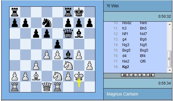 Пока не очень ясна идея Карлсена, что он предлагает своему сопернику. Черные Вэй И играют надежно.
