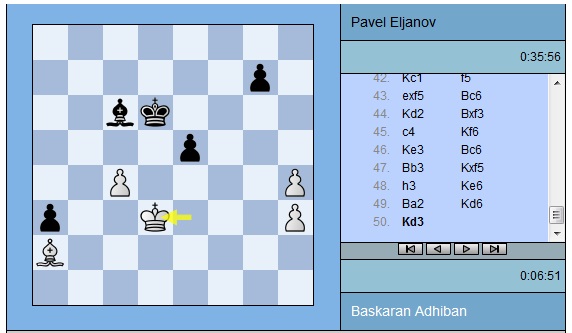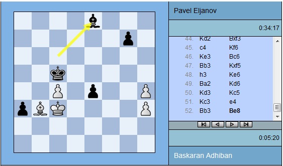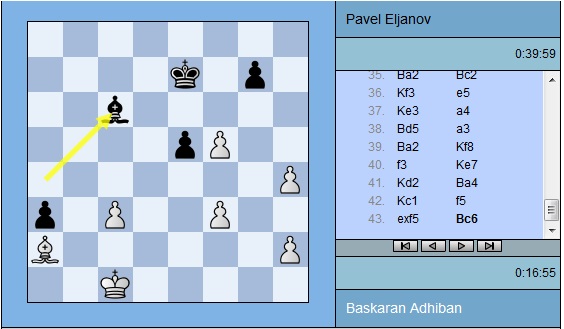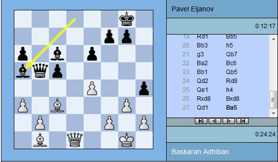 А что в партии лидера турнира? Черные Павла Эльянова уравняли положение в противостоянии с Башкараном Адхибаном, хотя комментаторы отмечают, что структура белых предпочтительнее.