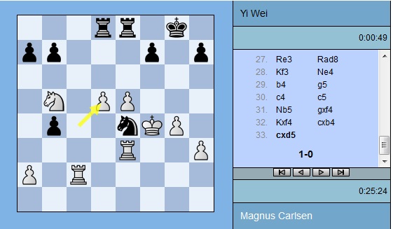 Несколько точных ударов — и... Магнус Карлсен выиграл у Вэй И белыми фигурами.