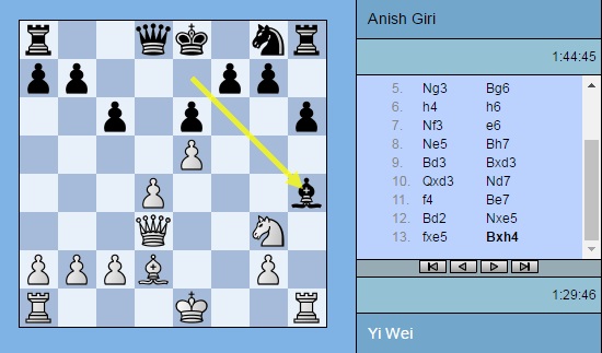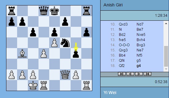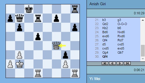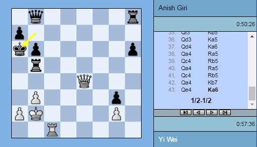 Гири, играя черными против китайца Вэя И, развил некоторое преимущество. Вполне возможно, что Гири прервет сегодня неприятную для себя серию ничейных результатов.