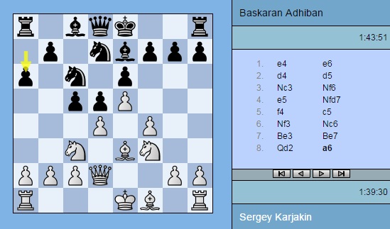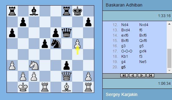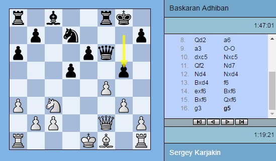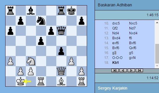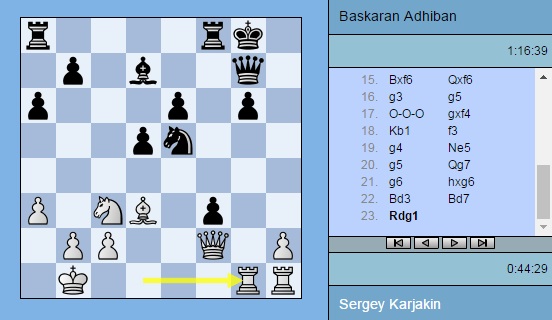 Любопытные события развиваются в партии Карякин — Адхибан. Позиция в целом равная, но индиец решил обострить ситуацию и вскрыть королевский фланг.