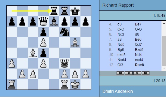 Третий российский шахматист Дмитрий Андрейкин также получил белые фигуры и постарается переиграть венгерского гроссмейстера Рихарда Раппорта.