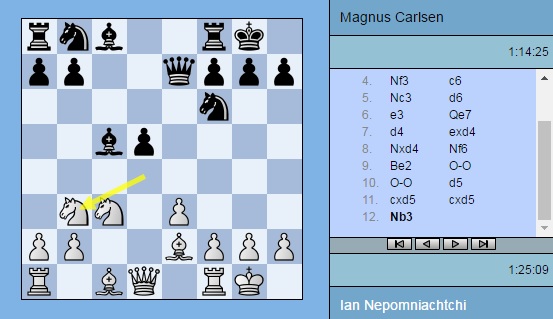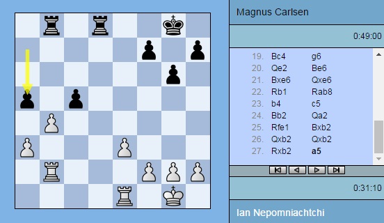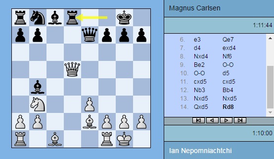Карлсен уже 15 минут раздумывает над своим следующим ходом. Ему не следует терять чернопольного слона в размене, но с другой стороны, если он уведет слона из-под удара конем, то потеряет пешку d. Стратегическую задачу сейчас решает норвежец — либо потеря сильного слона, либо жертва пешки, чтобы сохранить фигуру.