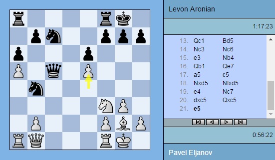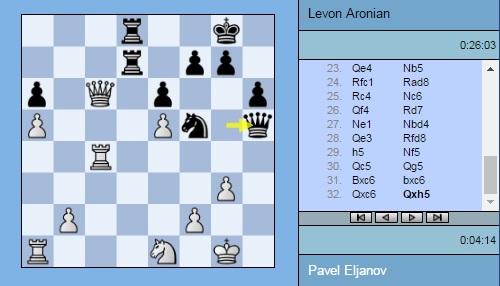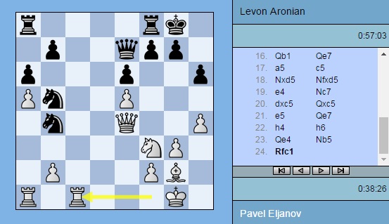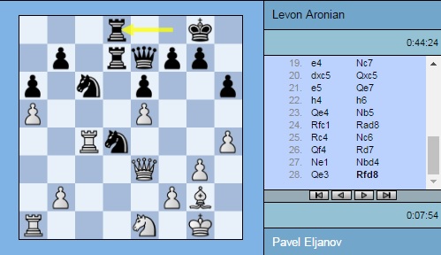 Аронян начинает оказывать давление на Эльянова, причем украинский шахматист может в скором времени оказаться в цугцванге.
