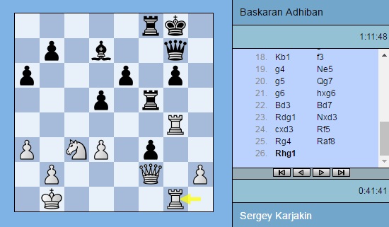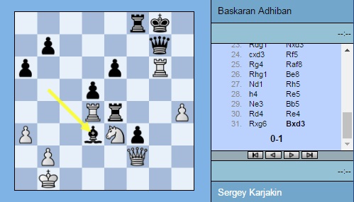 Карякин потерпел неожиданное поражение белыми от Адхибана. У него и так было тяжелое положение, но в конце концов, он допустил решающую ошибку ходом 31. Лхg6 в надежде на размен ладей, но соперник нашел победный ход 31. ... Сd3 шах, и чемпион мира по блицу признал свое поражение.