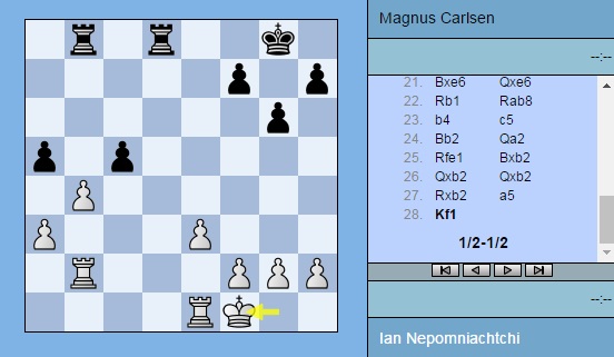 И не стали долго играть эндшпиль Карлсен с Непомнящим, а согласились на ничью. Итак, у нас есть первый результат дня.