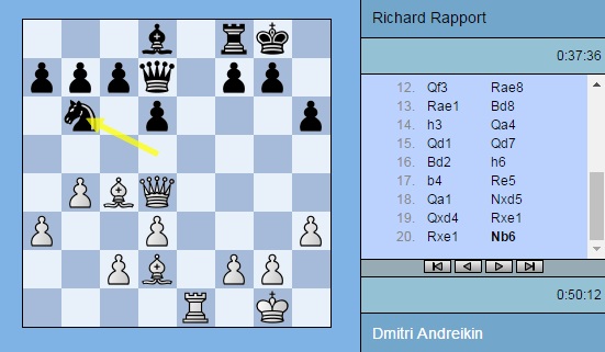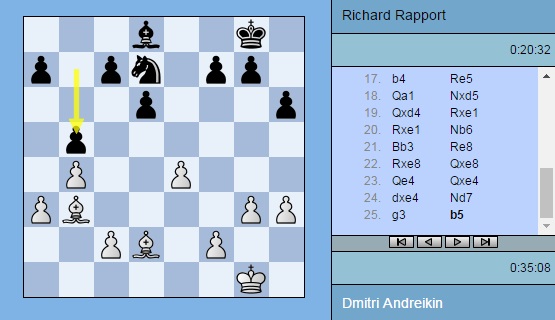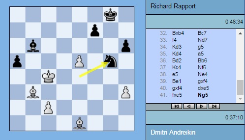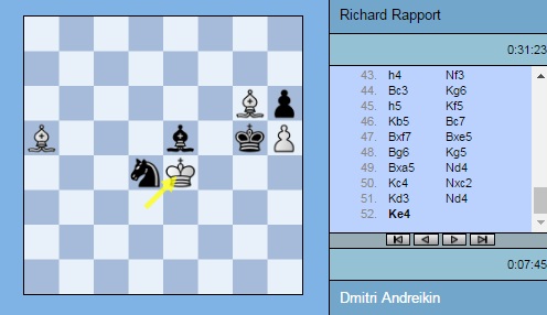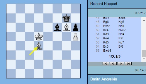 И разошлись миром россиянин и венгр. В этой позиции выигрыш фигуры ничего не дают Андрейкину. Произойдет размен чернопольных слонов, и белым не подступиться королем к пешке черных. Таким образом, Дмитрий набирает два с половиной очка и присоединяется к Карякину. У Раппорта полтора очка.
